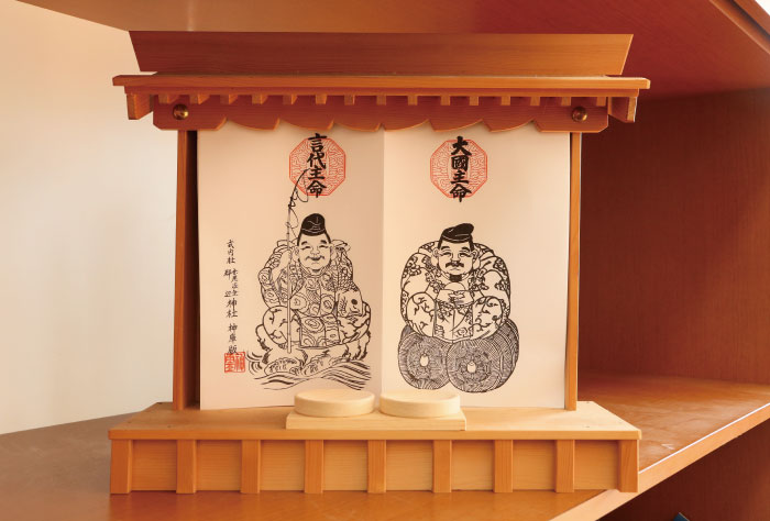 白木造りのお宮に、伊勢神宮の神宮大麻を中心に、氏神様、縁のある神社の神様のお神札を納めます。白木は経年により色が濃くなるため、神棚は基本、新しいものをお取り寄せ。神棚板の設置も承ります。